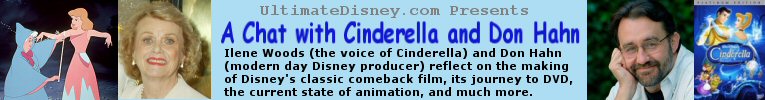 September 30, 2005 - This past Tuesday, Ilene Woods, the voice of Cinderella in Disney's 1950 animated classic of the same name, and Don Hahn, the producer behind the studio's modern cartoon hits like Beauty and the Beast and The Lion King, took out an hour to reflect upon Cinderella. Via conference call with at least a dozen media outlets, the pair enthusiastically spoke about the film from their different perspectives, with Woods reflecting on her first-hand production experiences as a cast member and Hahn acknowledging its place in the history of Disney animation. Naturally, many of the questions and answers revolved around next Tuesday's long-awaited Platinum Edition DVD, on which they both appear and which was the reason for this interview session.