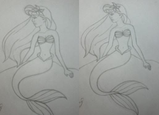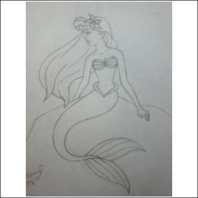 I like it, Jeremy! We never get to see Ariel do her sad-on-a-rock thing when she's in love with Eric under the sea, probably because she's so happy in love, and her crying in her cave just isn't the same as seeing her face and expression like this. I really like this one. The flower represents her love but she's sad over the "he love's me not" or "I can't be with him". I really love her expression, and her delicate features were actually done beautifully, it just needs the right proportions, like with the head, some moody color, and it would be amazing.