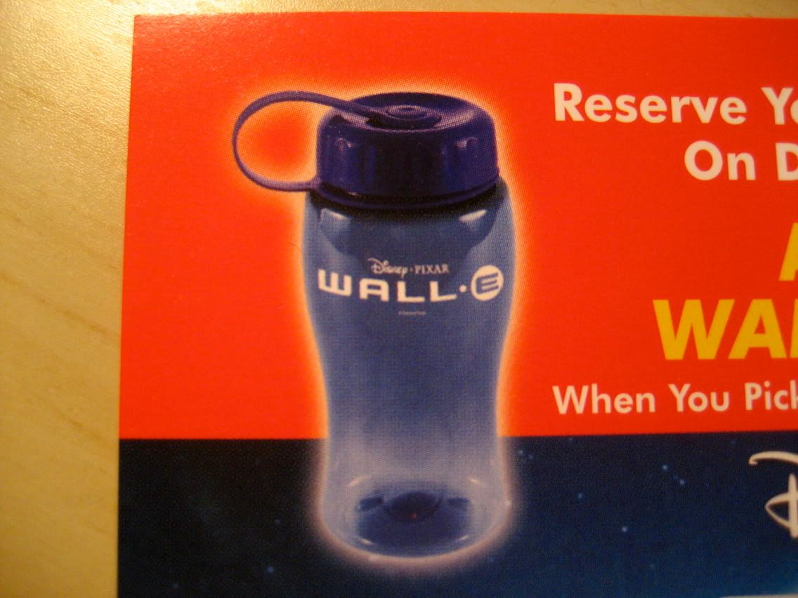 Pre-order WALL-E at Toys R Us and get a WALL-E water bottle. It is a bottle very much alike the one in the picture below. Except, it is a light blue and has written "Disney-Pixar WALL-E" on it in white, that's it.