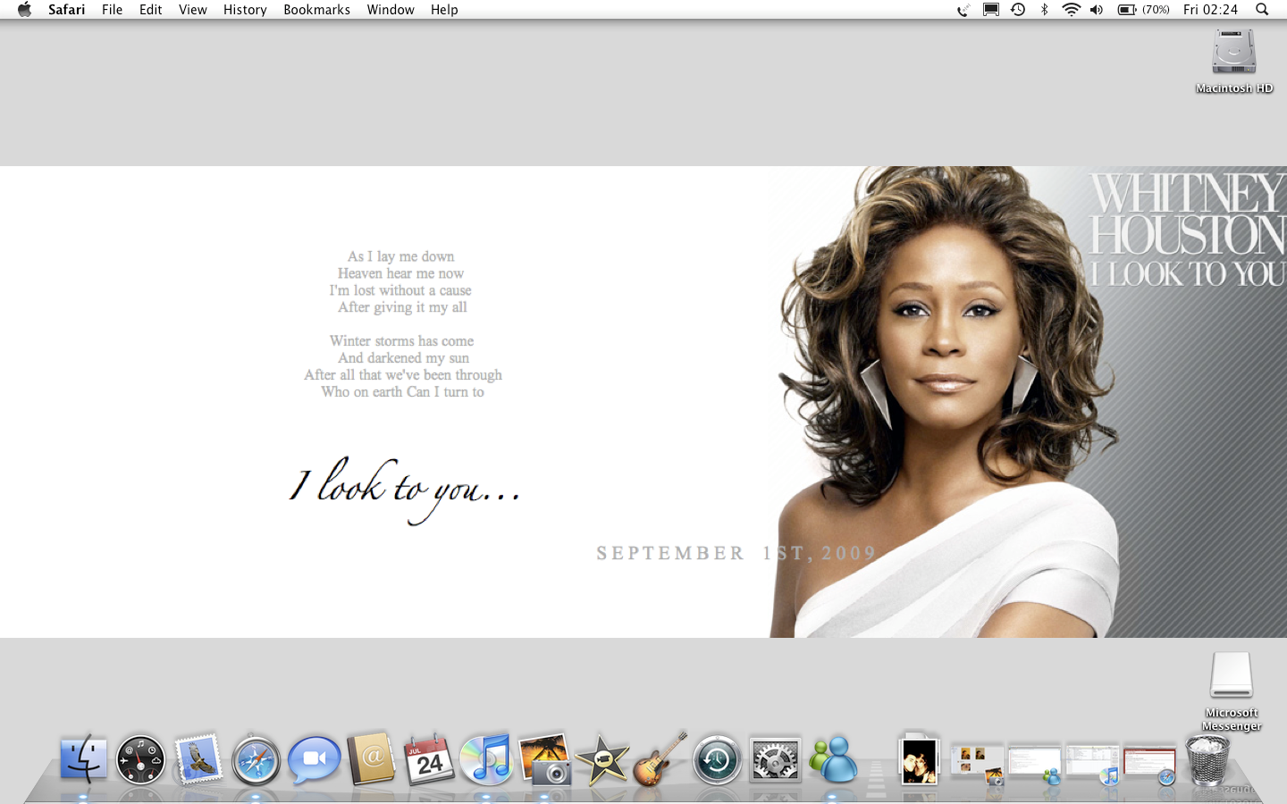 Identical to my signature, my desktop is a banner I made for Whitney Houston's comeback album I Look To You with the opening verse from the title track.