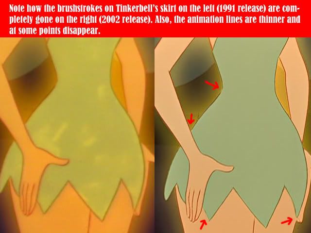 When the 2007 DVD is released, I'll make screen captures of it as well. I tried to get as close to the exact frame in each version as I could. Note how the brushstrokes (an animation flaw) from Tinker Bell's skirt are erased on all but the original video release.