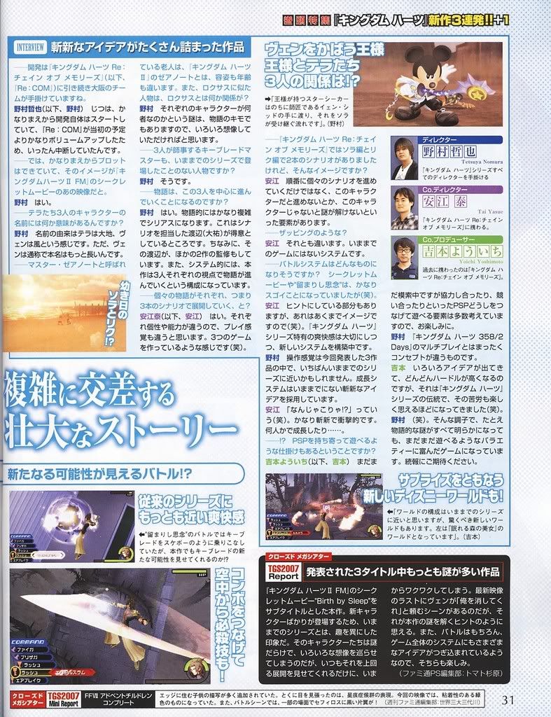 Jack Skellington wrote:3 games have been announced at TGS this year from the KH series, "Chain of Memories 2" for the Nintendo DS, "Kingdom Hearts 358/2 days" for cell-phones, and last but defenitly not least "Kingdom Hearts: Birth By sleep" for the PSP !!!