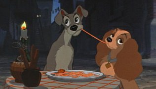 ![]() Disney will re-issue Lady and the Tramp as a 2-disc Platinum Edition on February 28, 2006. You can now read our review of this DVD. This new release boasts remastered picture (in both 2.55:1 widescreen and 1.33:1 full screen) and sound (including a Dolby Digital 5.1 Disney Enhanced Home Theater Mix). Among the many bonus features are two never-before-seen deleted sequences, a newly-discovered storyboard version of the film from 1943, the featurette "Finding Lady: The Art of the Storyboard", the documentary "Lady's Pedigree: The Making of Lady and the Tramp", "PuppyPedia" (a piece on the real-life dog breeds that inspired the film), the virtual board game "Disney Dog Trivia", a music video, and a Disney Virtual Puppy DVD-ROM feature. Click here to buy Lady and the Tramp: Platinum Edition from Amazon.com. Click here to read our Lady and the Tramp: Platinum Edition DVD Review. Review by James Reader Lady is a pampered cocker spaniel, who due to the scheme of two cruel Siamese cats finds herself muzzled. After running away she meets Tramp, a self-assured stray dog, who obviously comes from the "wrong side of the tracks". The two share adventures and a candle-lit Italian dinner, and love blooms. But will Tramp's carefree lifestyle and the consequences that go with it spoil their romance? If Lady and the Tramp was made and marketed today, it would be pigeonholed as a "romantic comedy." While this would be a rather simplistic categorisation of the film, it wouldn't be that far off.