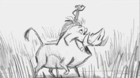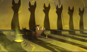 The animated menu depicts the scurrying meerkats from the film digging across the pride lands, as the options for the DVD are presented to the viewer. The film is presented in its original aspect ratio of 1.66:1 window-boxed in an anamorphic 1.78:1 transfer. It looks stunning, with absolutely no defects, looking about as crisp, clear, and colorful as possible. All the beautiful artwork of the film is represented in great detail. As far as I’m concerned, it matches the highly-praised transfer of the first film. When it comes to sound, it is equally satisfying, giving the option of either Dolby Digital 5.1 Surround Sound or DTS 5.1 (ironic, considering The Lion King only got a Dolby track). I listened to the Dolby track, and was extremely pleased. The surround is excellent, immersing the viewer in the many sounds of Africa, while providing considerable kick in the subwoofer. The soundtrack isn’t as lively or lush as the first movie’s, but it is represented superbly. “Hidden Mickey Hunt” is an interactive feature that helps one find all the images of Mickey’s head that have been hidden throughout The Lion King 1 ˝ by the artists. Available while watching the film, an indicator in the top, right hand corner of the screen lets you know when a “hidden mickey” is about to appear. When you find it, press the “enter” button in the DVD remote control. In this way, it records how many you have found. There are 20 to look for, and makes for a fun thing to do after seeing the film for the first time. I personally haven’t tried this out yet, but next time I will.