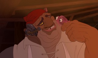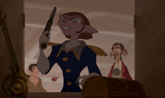 One gets the sense that there were a lot of cooks making this broth. Aladdin, Shrek, Pirates of the Caribbean, and National Treasure scribes Ted Elliott and Terry Rossio are credited alongside Clements and Musker for story. Sitcom veteran Rob Edwards receives a screenplay credit along with the directors. That is a modest amount of writers, suggesting plenty of uncredited contributions and rewrites during the 4½-year production that was pitched all the way back in the mid-'80s. In any event, the final product is a bit of a mess, full of ideas, characters, and those busy settings without the brilliant cohesion needed. It's not tidy and streamlined while also not being especially rich and dense. The foundation laid by Stevenson's story is strong enough to still qualify this as fine entertainment. But you can easily go ten years without any desire to rewatch it, which is unusual for a Disney animated feature and ensures that this will never exceed middle of the road status among the now 52-film canon.